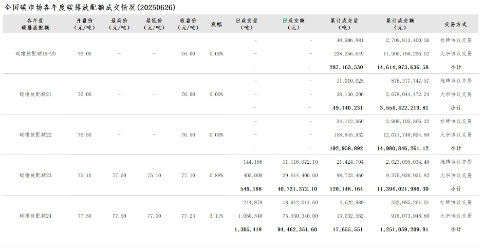 2025年1月1日至6月26日,全国碳市场碳排放配额成交量36,797,704吨,成交额2,762,596,210.11元。