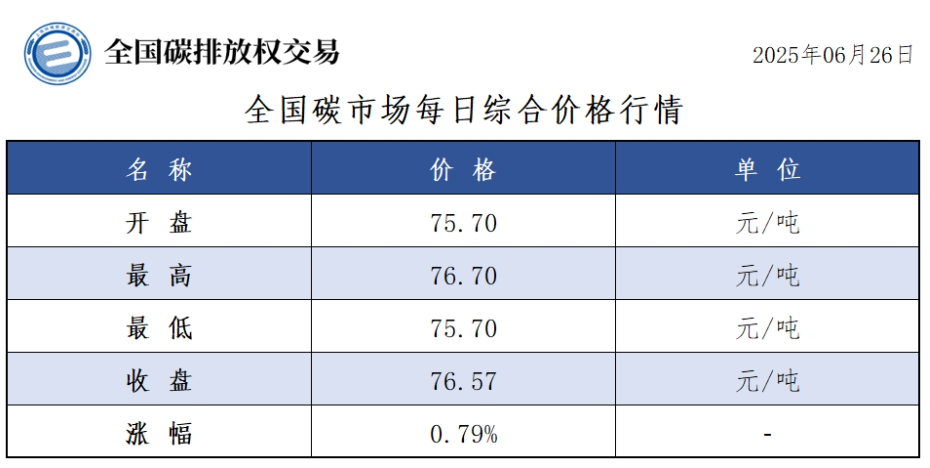 今日全国碳市场综合价格行情为: 开盘价75.70元/吨,最高价76.70元/吨,最低价75.70元/吨,收盘价76.57元/吨,收盘价较前一日上涨0.79%。