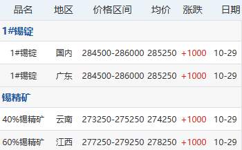 10月29日各地区现货锡价格