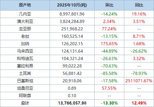 中国10月铝土矿进口量同比上升12.49% 分项数据一览
