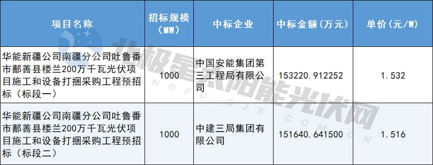 11月25日,中国华能电子商务平台发布华能新疆公司南疆分公司吐鲁番市鄯善县楼兰200万千瓦光伏项目施工和设备打捆采购工程预招标中标结果公示,项目分为两个标段,场区分为东西两个场区,均包含建设100万光伏及1座220kV汇集站。中标人分别为中国安能集团第三工程局有限公司、中建三局集团有限公司,单价分别为1.532元/W、1.516元/W。