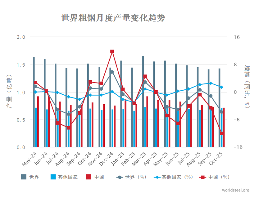 据世界钢铁协会对70个成员国的统计,10月份,世界粗钢产量为1.433亿吨,同比下降5.9%。