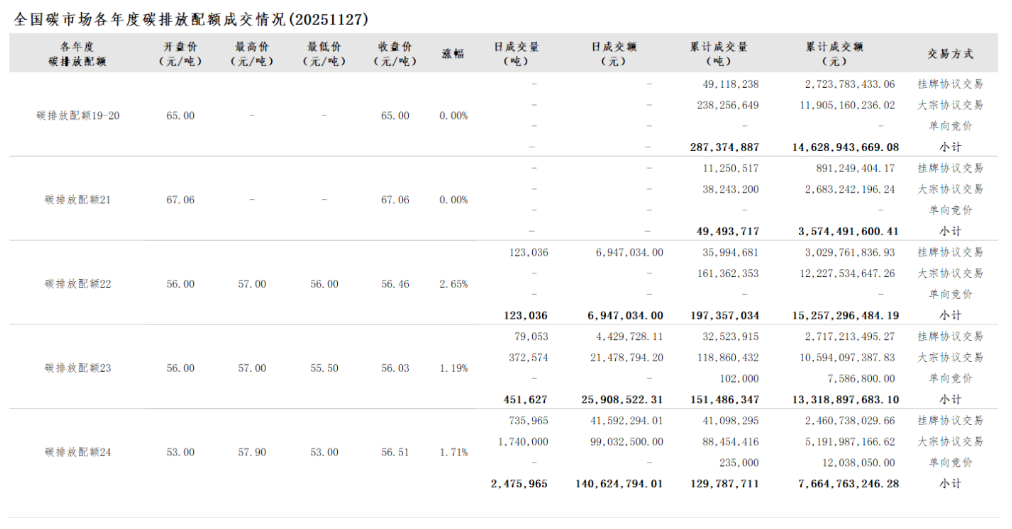 截至2025年11月27日,全国碳市场碳排放配额累计成交量815,499,696吨,累计成交额54,444,392,683.06元。