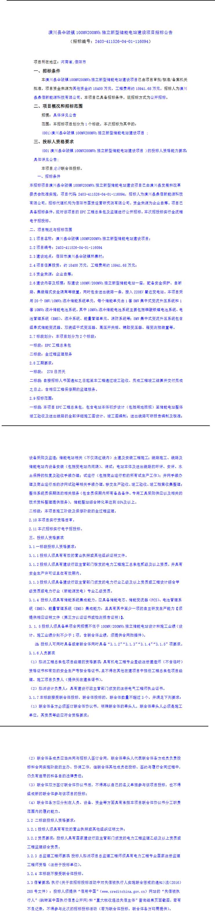11月27日,潢川县伞陂镇100MW/200MWh独立新型储能电站建设项目招标公告发布,该项目招标人为潢川县鼎信新能源科技有限公司,资金来源为企业自筹,目前已具备招标条件。