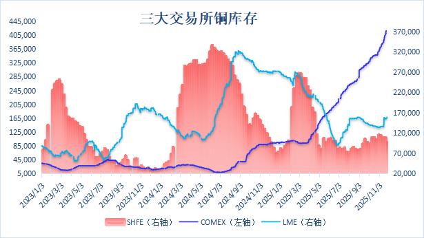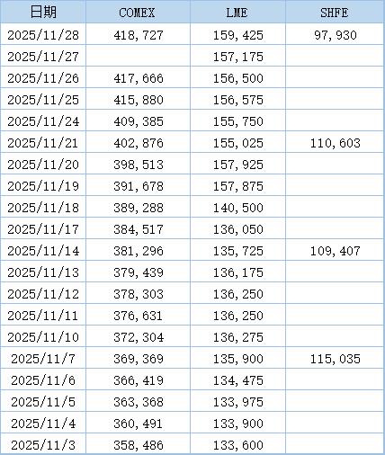 以下为2025年11月以来三大交易所铜库存数据:(单位:吨)