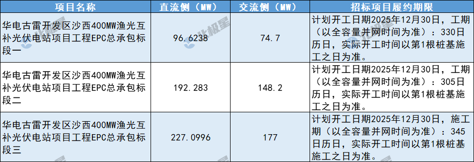 12月1日,中国华电集团电子商务平台发布华电古雷开发区沙西400MW渔光互补光伏电站项目工程EPC总承包招标公告,光伏电站装机规模为516.0064MWp,交流规模为400MW,共分三个标段,详情如下: