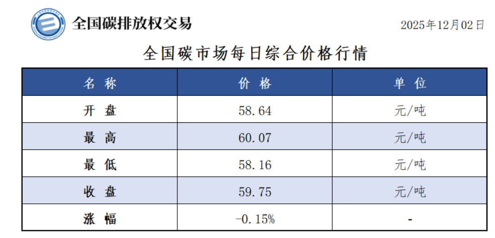 今日全国碳市场综合价格行情为: 开盘价58.64元/吨,最高价60.07元/吨,最低价58.16元/吨,收盘价59.75元/吨,收盘价较前一日下跌0.15%。
