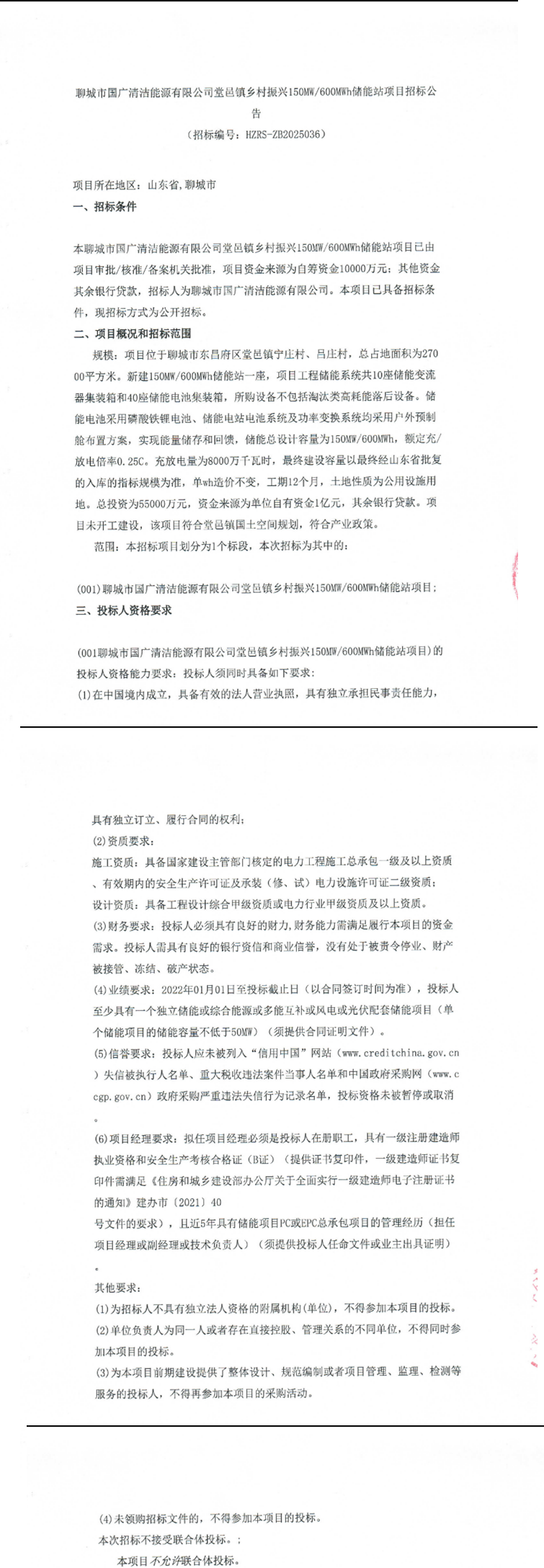 投标人需在2022年1月1日至投标截止日期间,具备至少一个容量不低于50MW的独立储能类项目经验,本次招标不接受联合体投标。