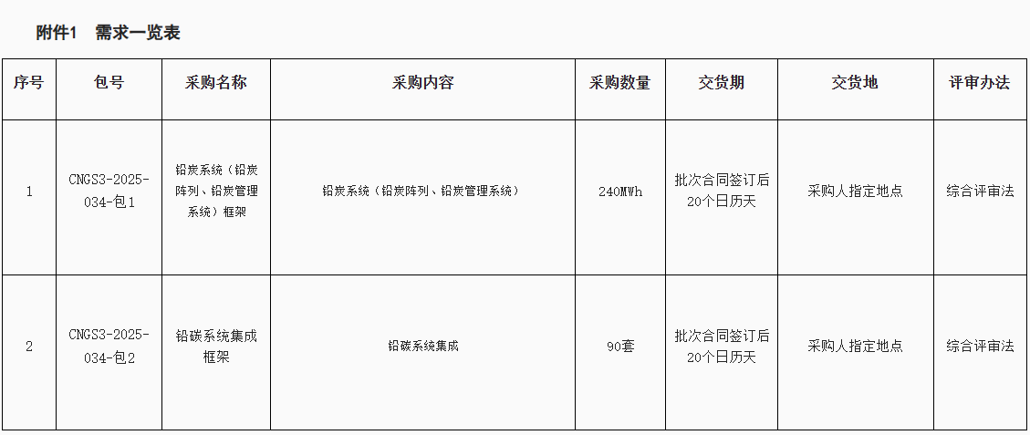 12月4日,中国电气装备集团储能科技有限公司铅炭系统、铅炭系统集成框架采购采购公告发布。本次采购铅炭系统(铅炭阵列、铅炭管理系统)240MWh、铅碳系统集成90套。采购人为中国电气装备集团储能科技有限公司
