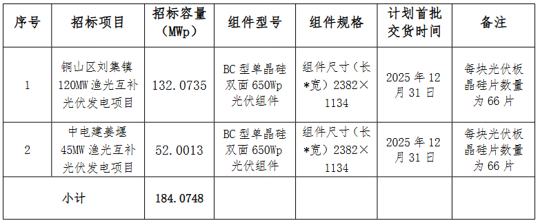 招标公告显示,铜山区刘集镇120MW、姜堰45MW渔光互补光伏发电项目规模合计184.0748MW,采购型单晶硅双面光伏组件。