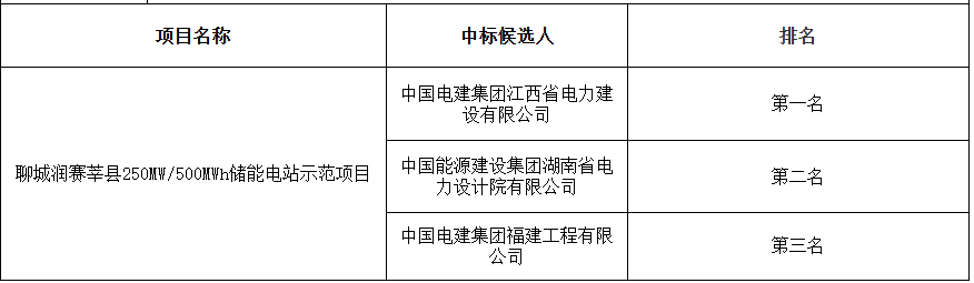 12月10日,聊城润赛莘县250MW/500MWh储能电站示范项目中标候选人公示。排名前三的中标候选人分别为中国电建集团江西省电力建设有限公司、中国能源建设集团湖南省电力设计院有限公司、中国电建集团福建工程有限公司。