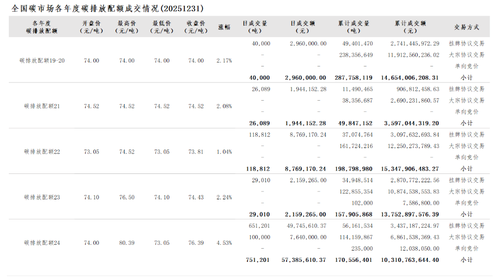 2025年1月1日至12月31日,全国碳市场碳排放配额成交量234,597,856吨,成交额14,629,891,128.06元。