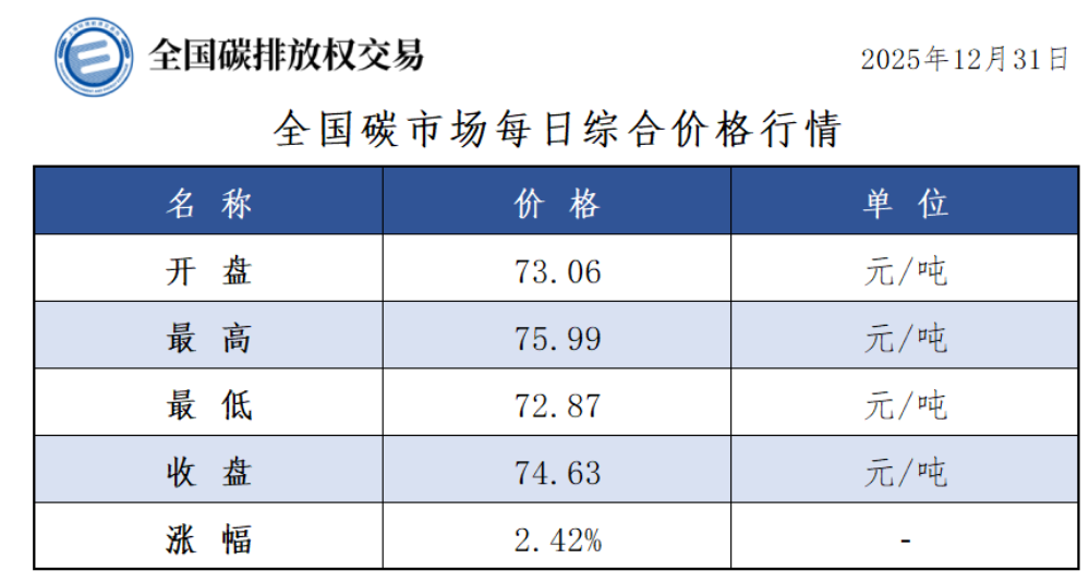 今日全国碳市场综合价格行情为: 开盘价73.06元/吨,最高价75.99元/吨,最低价72.87元/吨,收盘价74.63元/吨,收盘价较前一日上涨2.42%。