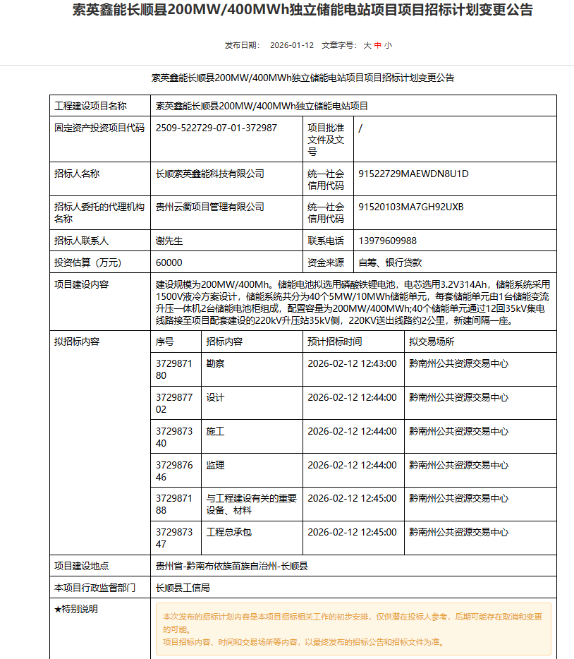 北极星储能网获悉,1月12日,长顺索英鑫能科技有限公司发布200MW/400MWh独立储能电站项目招标计划,投资估算60000万元,约合1.5元/Wh。资金来源自筹、银行贷款,项目建设地点贵州省黔南布依族苗族自治州长顺县。