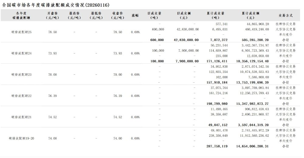 截至2026年1月16日,全国碳市场碳排放配额累计成交量872,514,218吨,累计成交额58,213,647,459.77元。