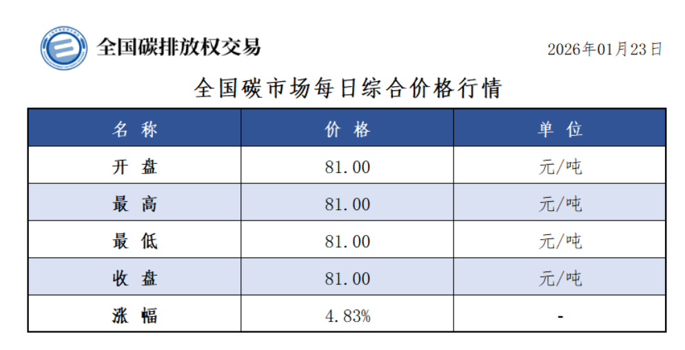 1月23日全国碳市场价涨4.83% 碳排放配额总成交458236吨【交易日报】