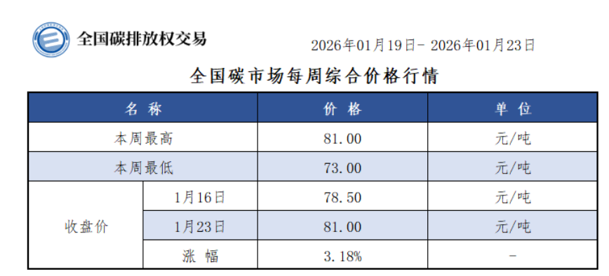本周全国碳市场综合价格行情为:最高价81.00元/吨,最低价73.00元/吨,收盘价较上周五上涨3.18%。