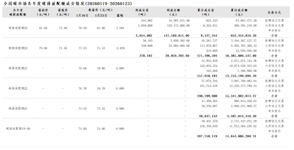 2026年1月1日至1月23日,全国碳市场碳排放配额成交量10,072,863吨,成交额727,158,231.80元。
