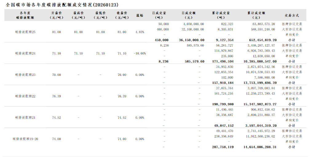 1月23日全国碳市场价涨4.83% 碳排放配额总成交458236吨【交易日报】