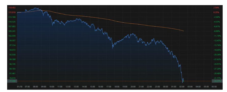 恐慌性抛售席卷贵金属市场,现货白银日内跌幅扩大至30%以上,向下跌破76美元/盎司,日内下跌34.36%。现货黄金日内跌幅扩大至12%,报4705.29美元/盎司。现货铂金跌超20%,现货钯金跌约15%。