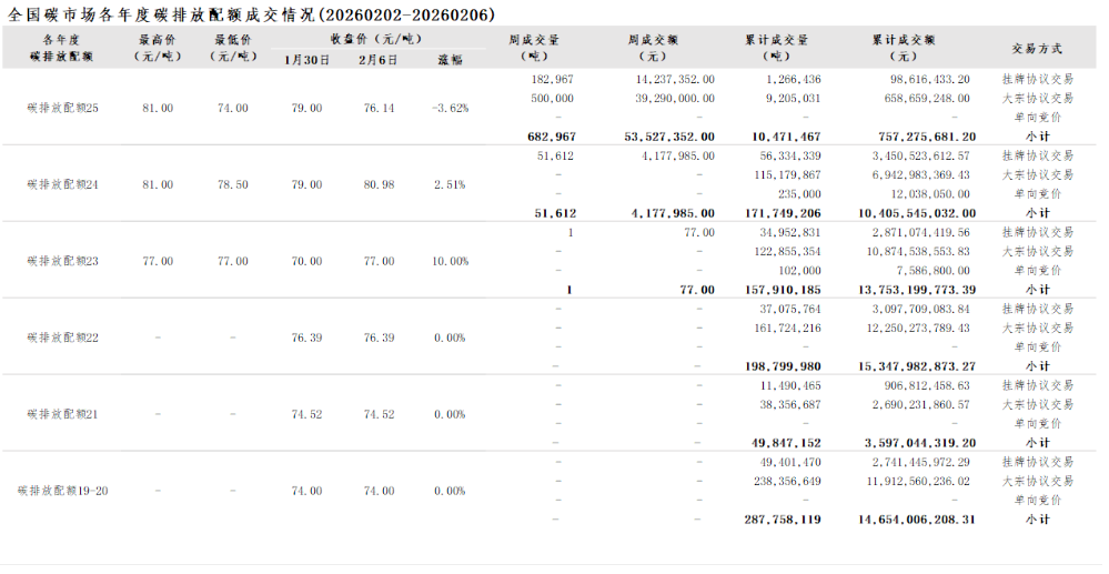 2026年1月1日至2月6日,全国碳市场碳排放配额成交量11,669,589吨,成交额852,435,655.80元。