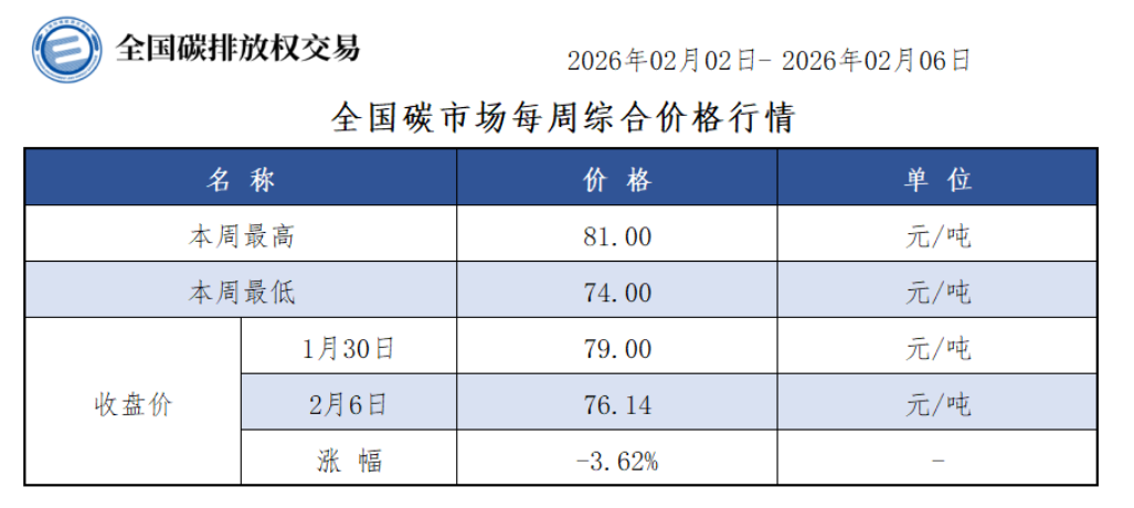 本周全国碳市场综合价格行情为:最高价81.00元/吨,最低价74.00元/吨,收盘价较上周五下跌3.62%。
