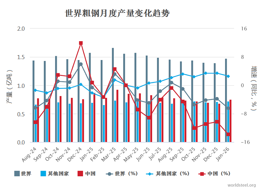 1月份世界粗钢产量同比下降6.5%
