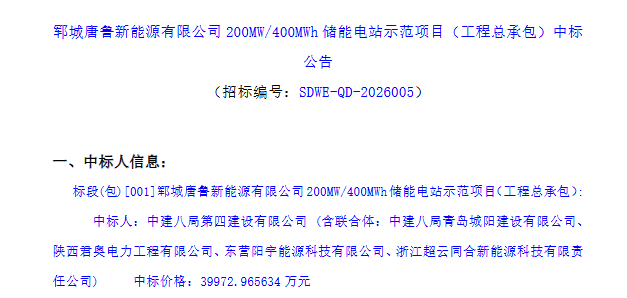 北极星储能网获悉,3月2日,郓城唐鲁新能源有限公司200MW/400MWh储能电站示范项目中标公告发布,中标人为中建八局第四建设有限公司(含联合体:中建八局青岛城阳建设有限公司、陕西君奥电力工程有限公司、东营阳宇能源科技有限公司、浙江超云同合新能源科技有限责任公司),中标价格为39972.965634万元,约合单价0.999元/Wh。