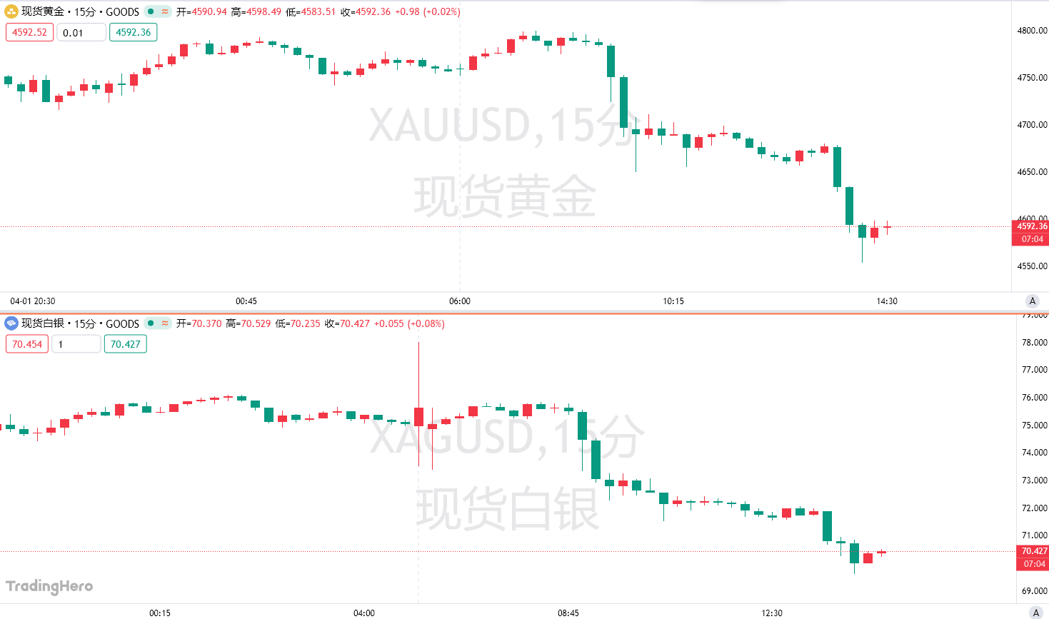 在特朗普表示这场持续一个月的冲突“已接近尾声”,但美国将在未来两到三周内对伊朗实施“极其猛烈的打击”后,暴跌超3%,彻底回吐了早些时候的涨幅,并一度跌至4550美元附近,现有所反弹;白银日内大跌超6%,美股期货下挫,美元指数上涨0.5%并重回100关口上方,而原油价格则大涨超7%。