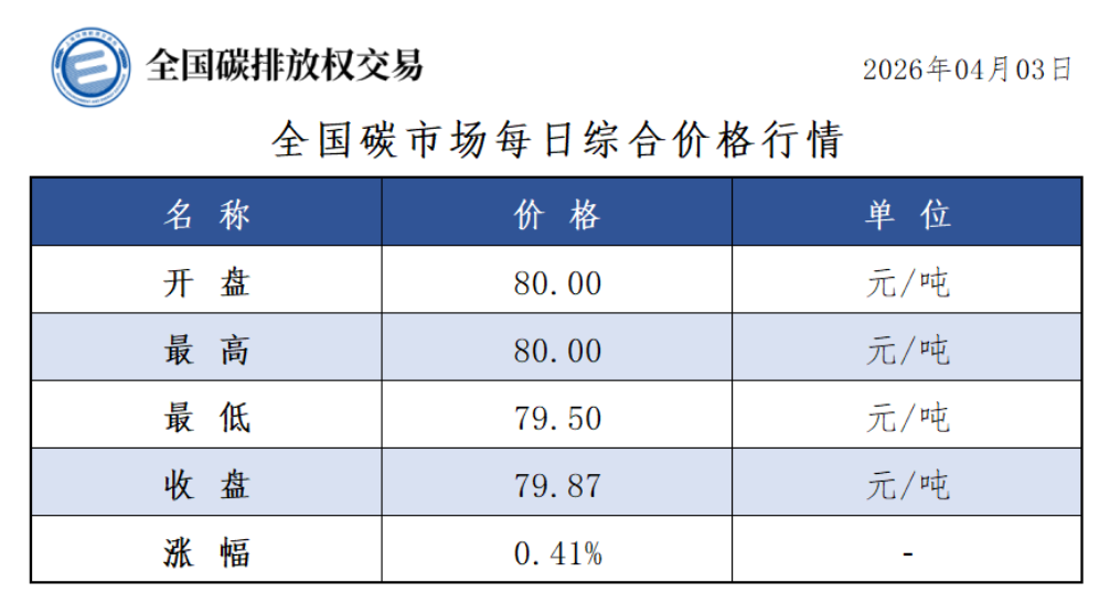 4月3日全国碳市场价与前一日持平 碳排放配额总成交62978吨【交易日报】