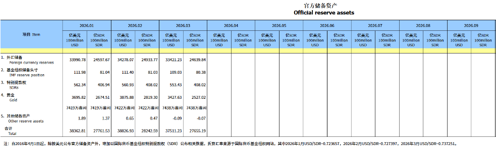 2026年3月,受全球宏观环境、主要经济体货币政策及预期等因素影响,美元指数上涨,全球主要金融资产价格下跌。汇率折算和资产价格变化等因素综合作用,当月外汇储备规模下降。我国经济运行总体平稳、稳中有进,高质量发展取得新成效,为外汇储备规模保持基本稳定提供支撑。