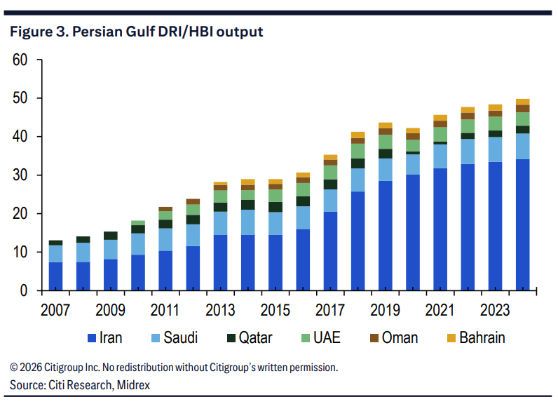 花旗表示,伊朗钢铁高度依赖直接还原铁(DRI)气基生产工艺,这与全球主流的高炉炼铁路径截然不同,也使得替代难度大幅提升。