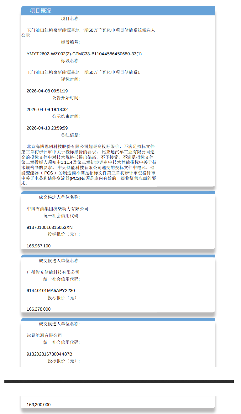 第一中标候选人:中国石油集团济柴动力有限公司(昆仑制造全资子公司),投标报价16596.71万元,折合单价约0.5186元/Wh;