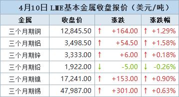伦敦时间4月10日17:00(北京时间4月11日00:00),LME三个月期铜上涨164美元,或1.29%,收报每吨12,845.5美元。