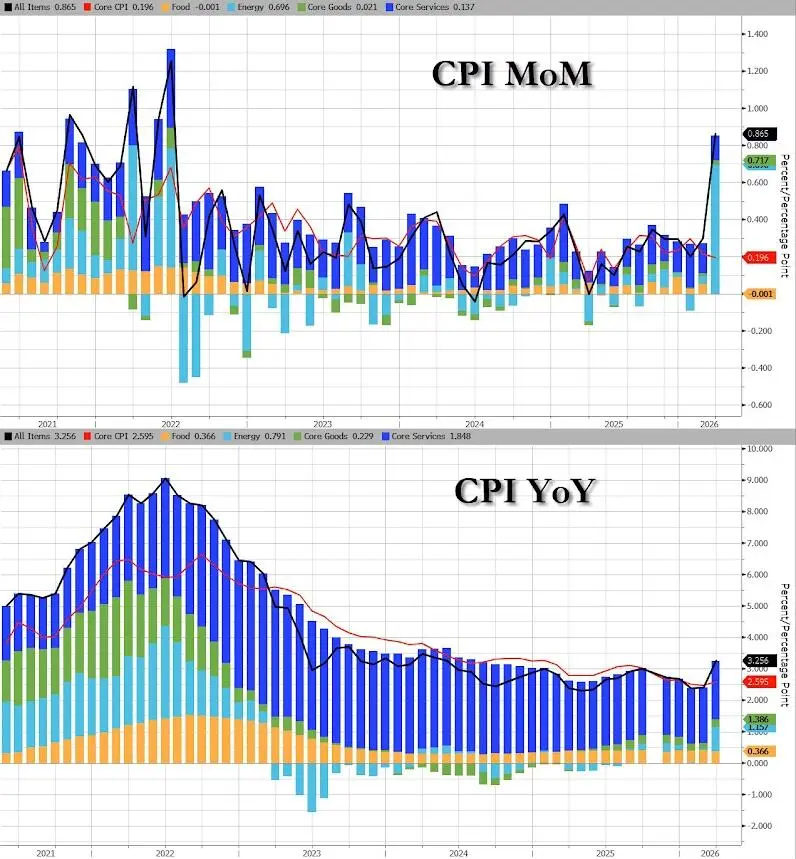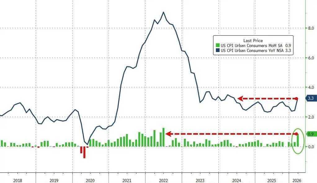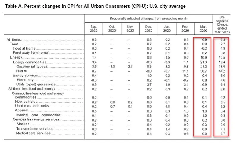 美国劳工统计局周五公布数据显示,3月消费者价格指数(CPI)环比上涨0.9%,与市场预期一致,为2022年6月以来最大单月涨幅;同比上涨3.3%,较2月的2.4%显著加速,创2024年以来最高水平。汽油价格创1967年有记录以来最大单月涨幅,几乎独力支撑本月整体涨幅,贡献了月度增幅的近四分之三。