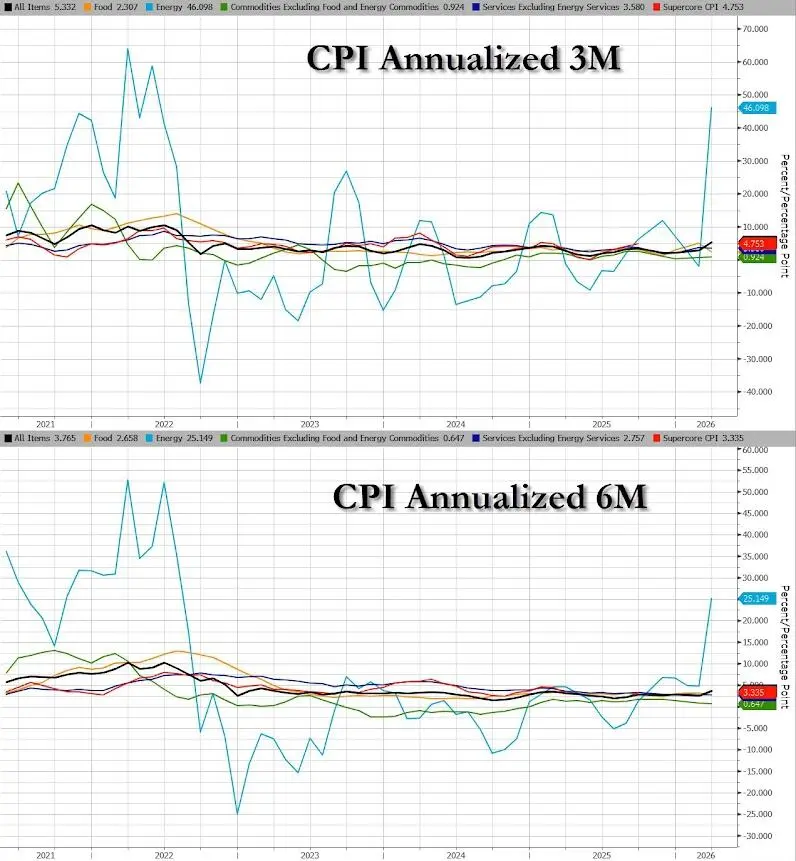 美伊战争是本次通胀骤升的直接导火索。3月能源CPI环比上涨10.9%,创2005年9月以来最大单月涨幅;汽油价格环比飙升21.2%(季节调整前涨幅高达24.9%),为该系列数据自1967年发布以来最大单月涨幅,单项贡献了整体CPI月环比涨幅的近四分之三。
