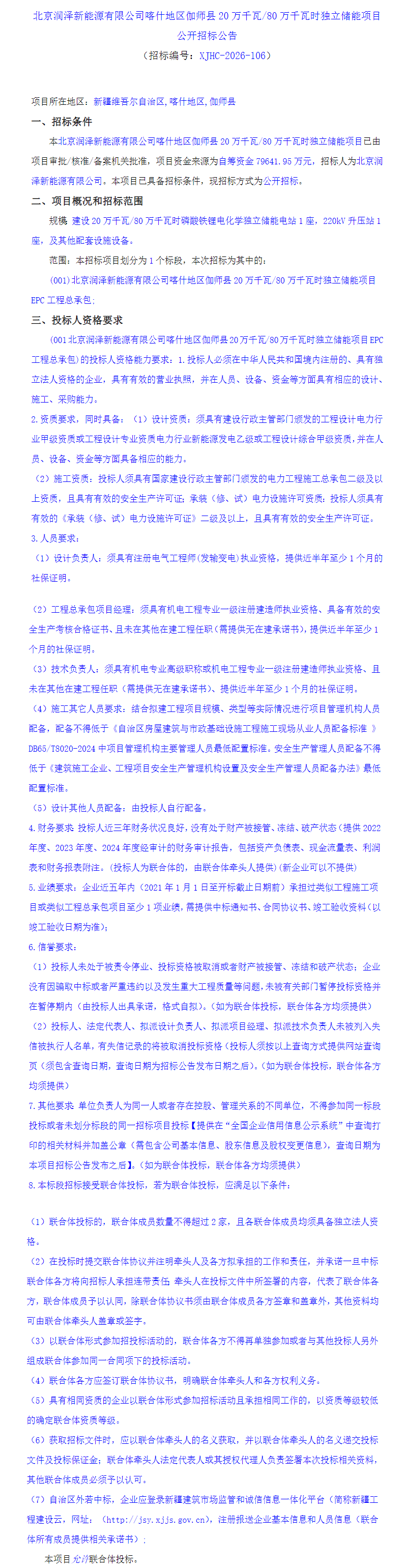 北极星储能网讯:2026年4月14日,北京润泽新能源有限公司新疆喀什地区伽师县200MW/800MWh独立储能项目EPC发布招标公告,项目资金来源为自筹资金79641.95万元,合单价0.996元/Wh。招标人为北京润泽新能源有限公司。