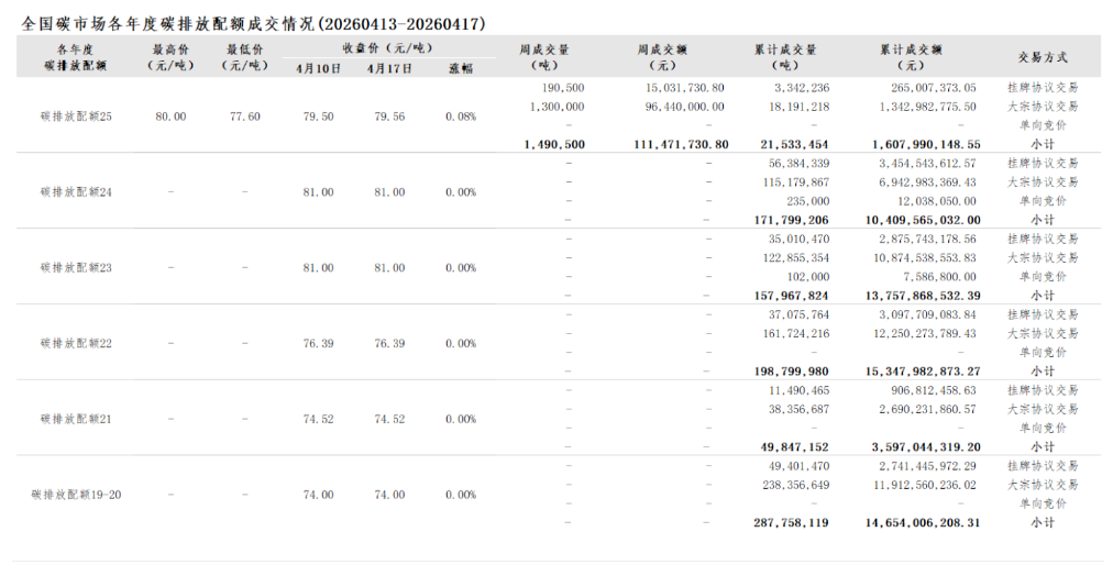 2026年1月1日至4月17日,全国碳市场碳排放配额成交量22,839,215吨,成交额1,711,838,882.15元。