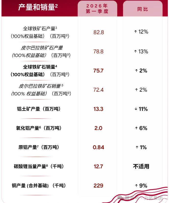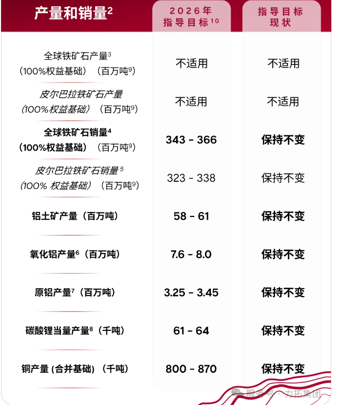 1 铜当量产量 = 力拓权益产量份额 / 产量换算因子 x 产品价格(美元/吨)/ 铜价格(美元/吨)。价格基于长期共识价格。2 力拓所属权益,除非另有说明。3 皮尔巴拉业务及加拿大铁矿公司(IOC)的指可销售产量(经破碎、筛分和选矿之后)。西芒杜项目的产量则指在SimFer矿山矿界内、火车装车前的破碎矿石量:西芒杜铁矿石的最终(三级)破碎在中国进行。4 包括皮尔巴拉和加拿大铁矿公司(IOC)的全部发运量,包含运往我们港口贸易业务的货物量;不含我们港口贸易业务的发运量。此外,该指导目标还包括西芒杜项目的销量,这部分指已在中国完成三级破碎并由客户提货的矿石。矿山产量与销量之间存在约2-3个月的滞后期,这涵盖了矿石从矿山经铁路运至几内亚港口、海运至中国、在中国进行三级破碎以及客户提取最终产品所需的时间。2026年销量指导目标(100%权益基础)为:加拿大铁矿公司(IOC)1500-1800万吨,西芒杜500-1000万吨 5 皮尔巴拉铁矿的指导目标仍取决于计划开采区域的审批时间和遗产清查工作进展。6 昆士兰氧化铝有限公司(QAL)产量现按100%权益基础计算。7 仅包含原铝 8 2025年第一季度,阿卡迪姆的碳酸锂当量(LCE)产量为1.72万吨(按100%权益基础为2万吨),其中0.56万吨(按100%权益基础为0.65万吨)是自3月收购完成后生产的;阿卡迪姆的碳酸锂当量发运量为1.21万吨(按100%权益基础为1.52万吨),其中0.38万吨(按100%权益基础为0.5万吨)是自2025年3月收购完成后发运的。Rincon启动工厂的产量现已被纳入2026年第一季度的统计。9 湿公吨 10 其他说明请参见第2部分,2026年指导目标。