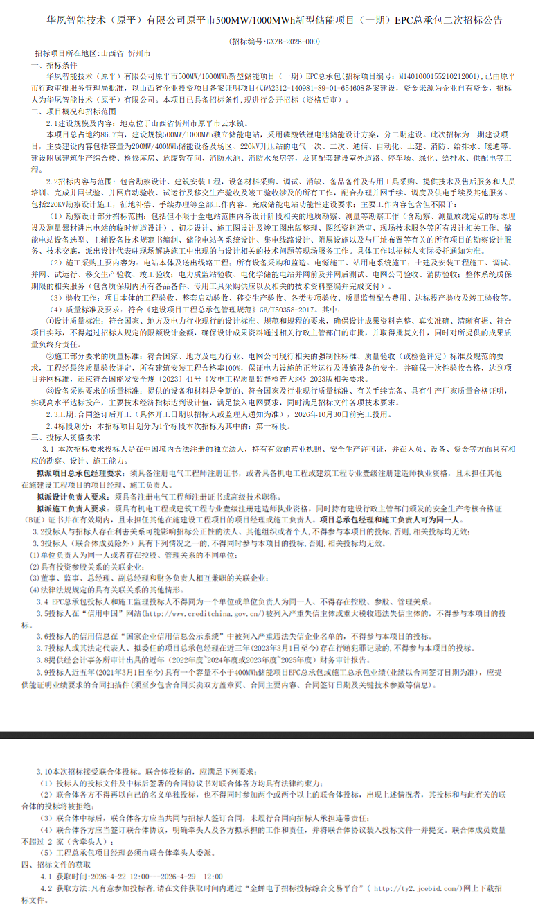 北极星储能网获悉,4月22日,华夙智能技术(原平)有限公司原平市500MW/1000MWh新型储能项目(一期)EPC总承包二次招标公告发布。