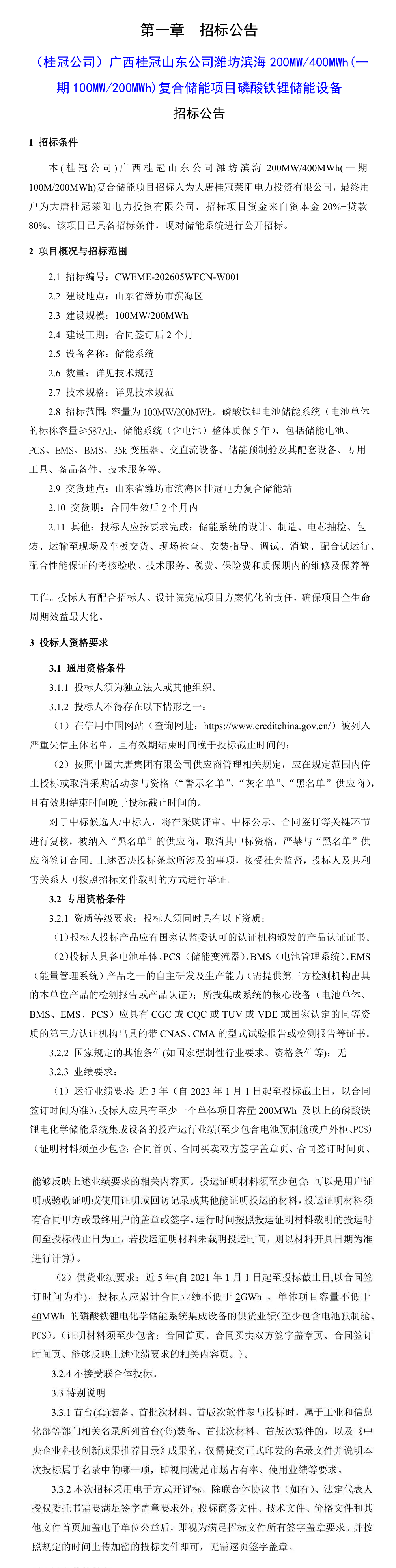 北极星储能网讯:2026年4月21日,广西桂冠山东公司潍坊滨海200MW/400MWh(一 期100MW/200MWh)复合储能项目储能设备招标,建设地点为山东省潍坊市滨海区。