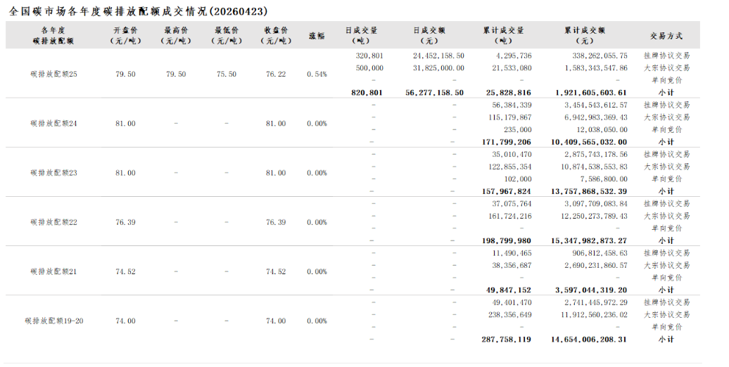 2026年1月1日至4月23日,全国碳市场碳排放配额成交量27,134,577吨,成交额2,025,454,337.21元。