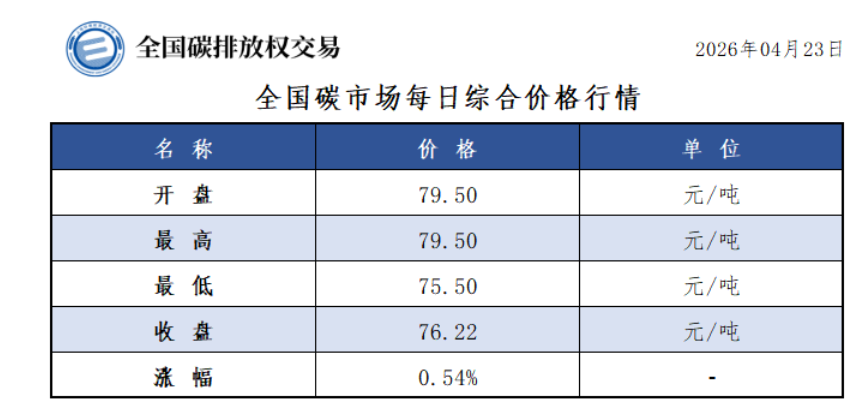 4月23日全国碳市场价涨0.54% 碳排放配额总成交820801吨【交易日报】