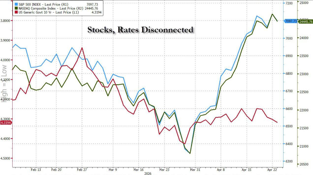(标普和纳指与10年期美债收益率走势背离)