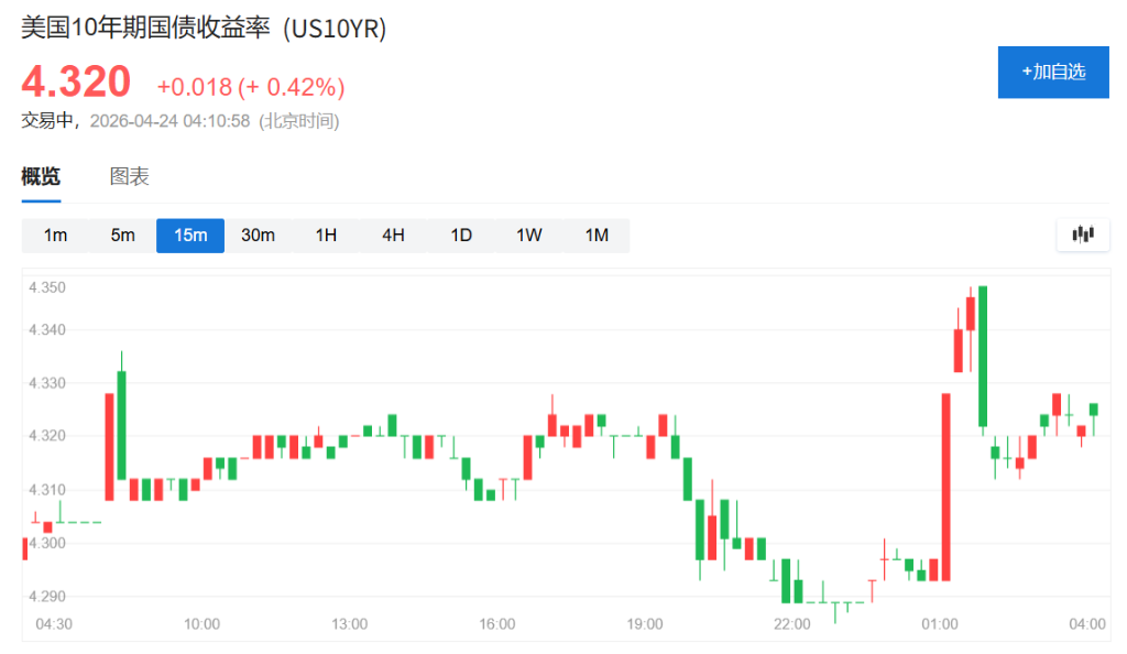 美国10年期收益率上行,北京时间00:58出现一波短线拉升行情,一度从4.29%附近涨向4.35%。