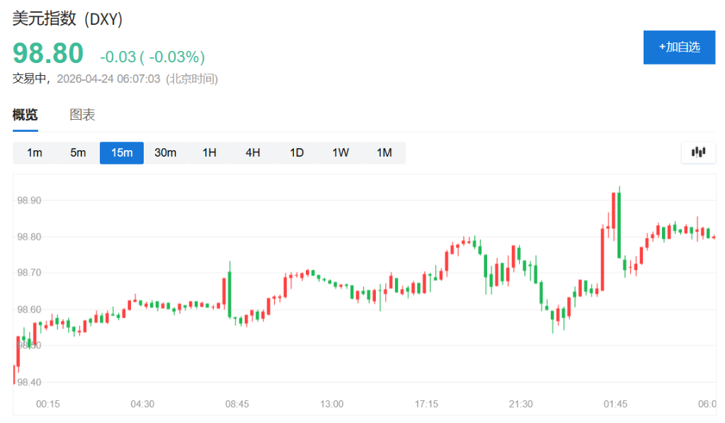 纽约尾盘,ICE美元指数涨0.24%,报98.822点,日内交投区间为98.534-98.939点,北京时间01:00出现一波显著的快速拉升行情。