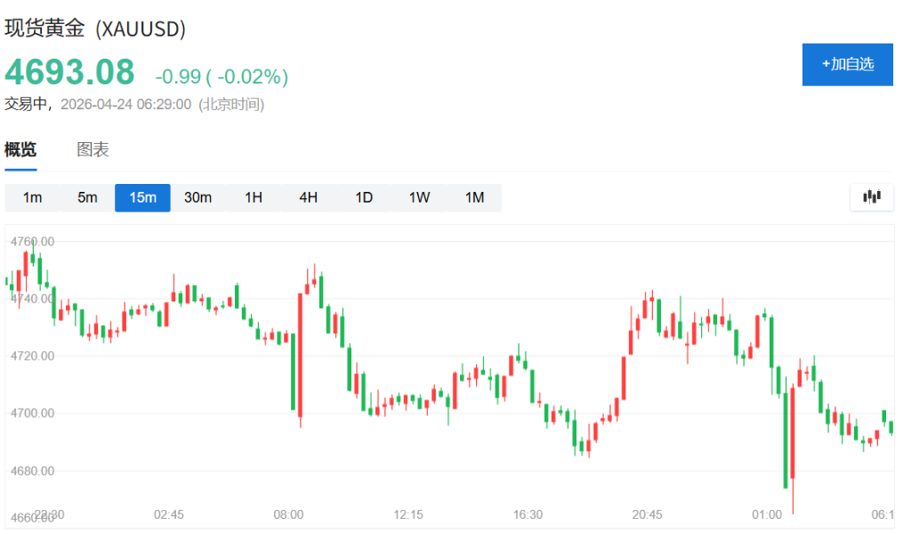 现货黄金跌1%,纽约中午时段曾逼近4600美元关口。