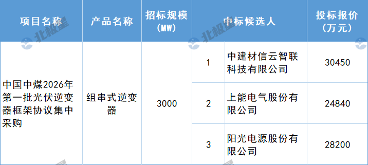 4月27日,中国中煤2026年第一批光伏逆变器框架协议集中采购中标候选人公示,第一中标人为中建材信云智联科技有限公司,投标报价30450万元。
