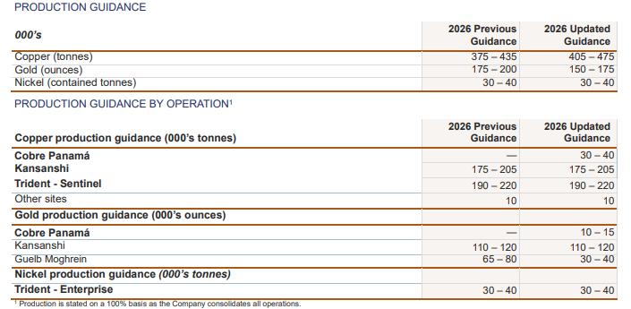 公司2026年初始业绩指引于2026年1月发布,当时未纳入处于封存与安全运维(P&SM)阶段的巴拿马铜矿(Cobre Panamá),以及处于停产维保状态的雷文斯索普(Ravensthorpe)矿区。随着巴拿马政府(GOP)正式批准矿区库存矿石外运、加工及出口,巴拿马铜矿2026全年产量、单位成本与资本开支现已纳入最新业绩指引范围。