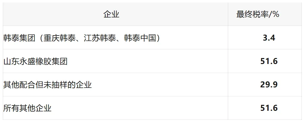 在抽样阶段,欧委会选取了山东永盛橡胶集团和韩泰集团这两家中国出口生产商,作为样本企业,合计占中国对欧出口量的21.7%。尽管成山、佳通、锦湖等企业申请加入样本或单独审查,但欧委会以时间有限、现有样本已具代表性为由予以驳回。